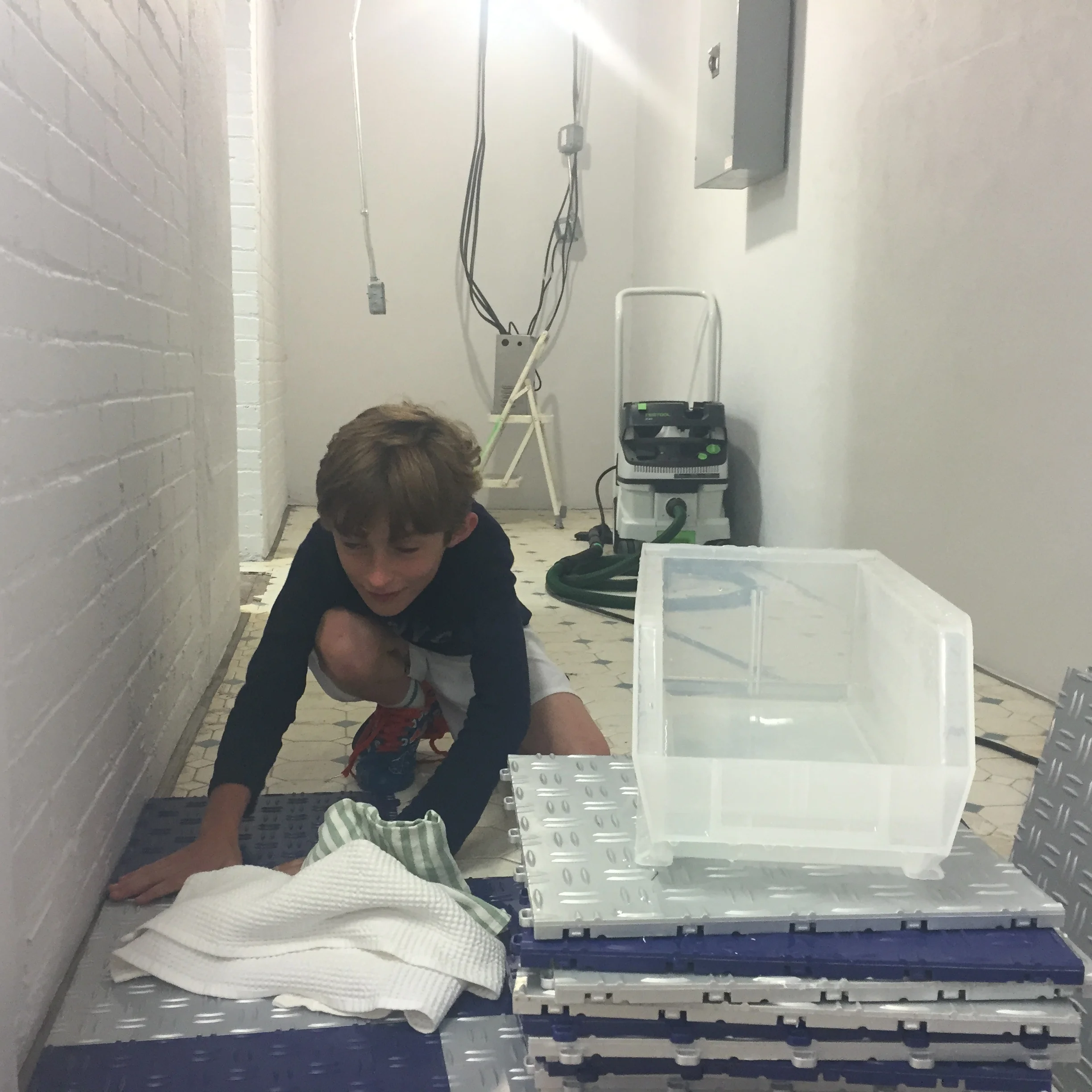 The lift has been installed. I decided to go with 12” x 24” porcelain tiles (Iris Deluxe Perla Honed). A Schluter DITRA uncoupling membrane was installed over the entire floor and the tile was installed with 1/16” spacing and epoxy grout. The LED floor lights have O-rings that hold it in place and provide a water-tight seal.
